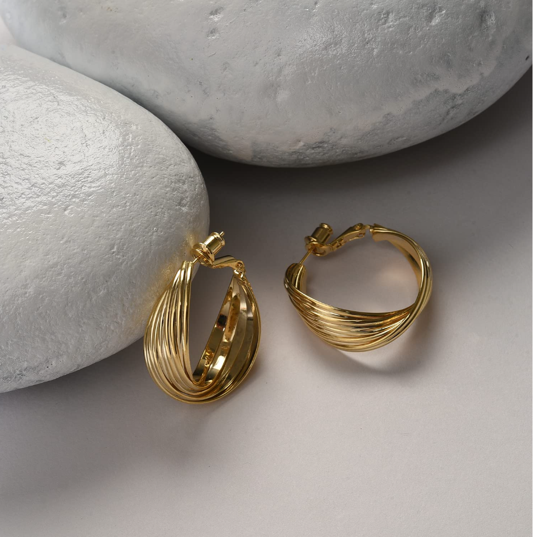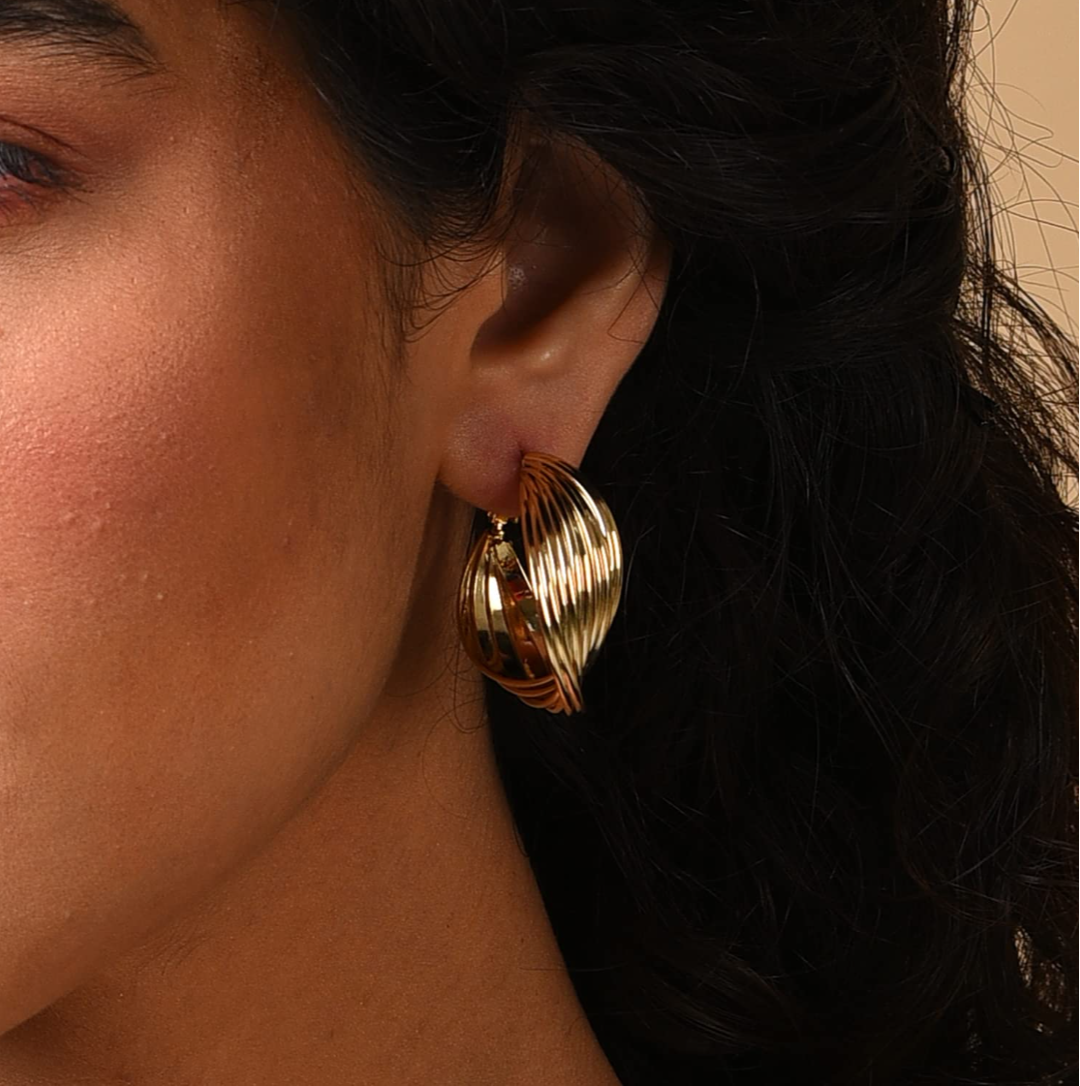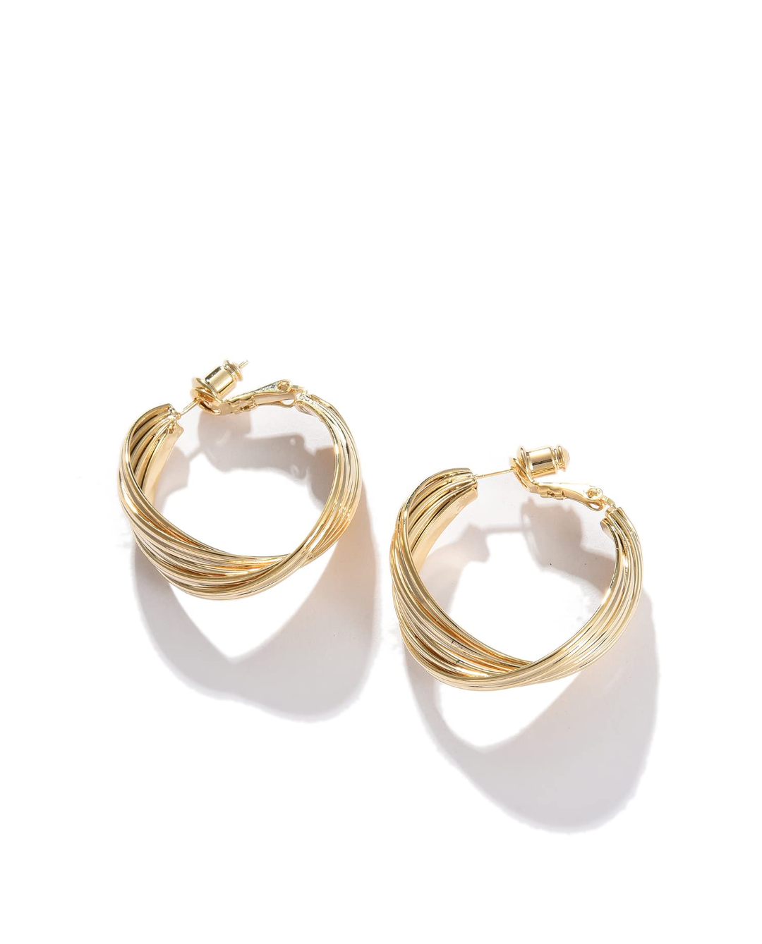 These multi-layered gold-tone hoop earrings are designed to blend contemporary sophistication with timeless elegance. Each earring features three gracefully intertwined bands, creating a sculptural silhouette that catches and reflects the light beautifully. The polished, shiny finish enhances their luxurious appeal, ensuring they stand out whether worn for casual outings or special occasions.