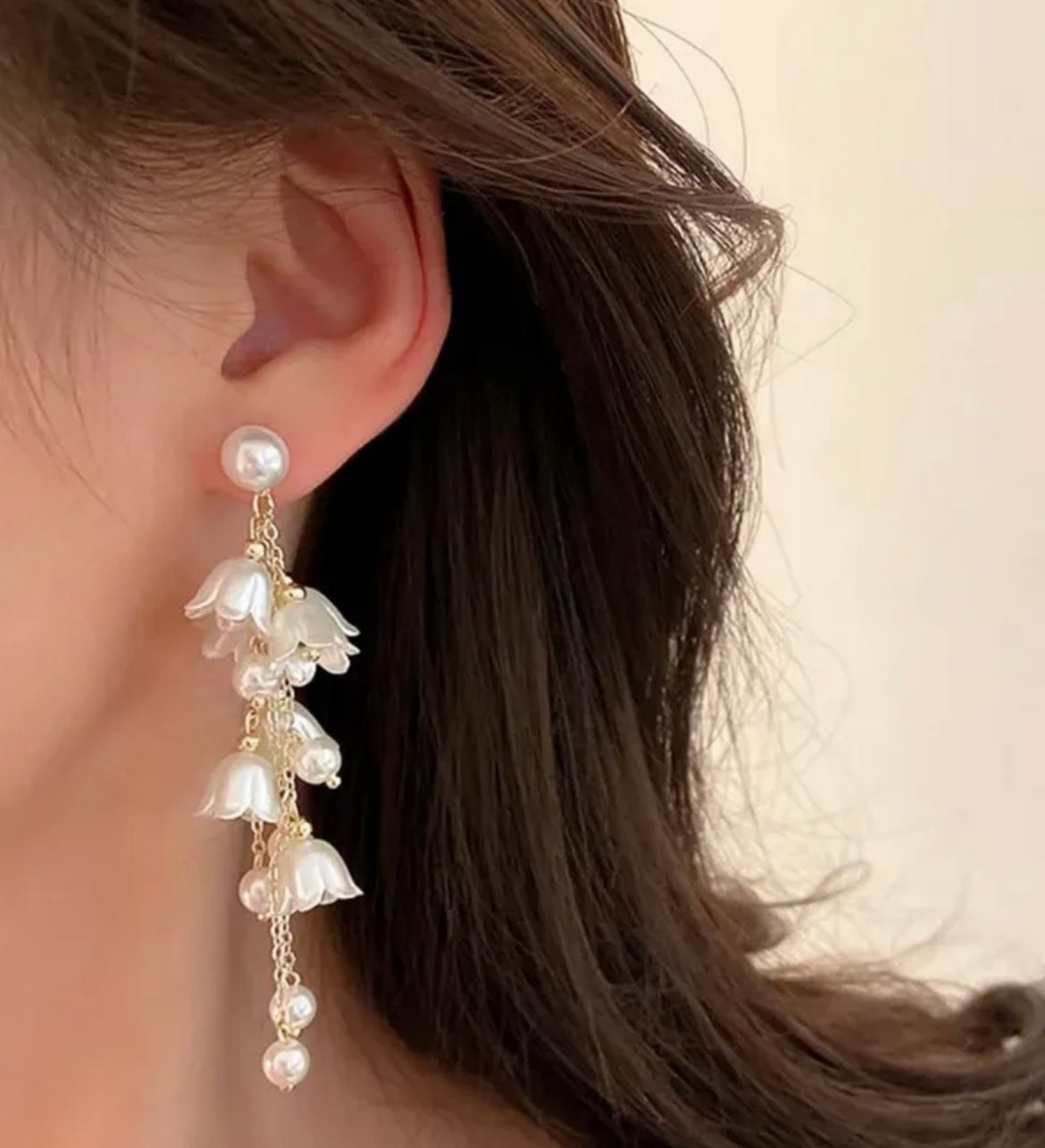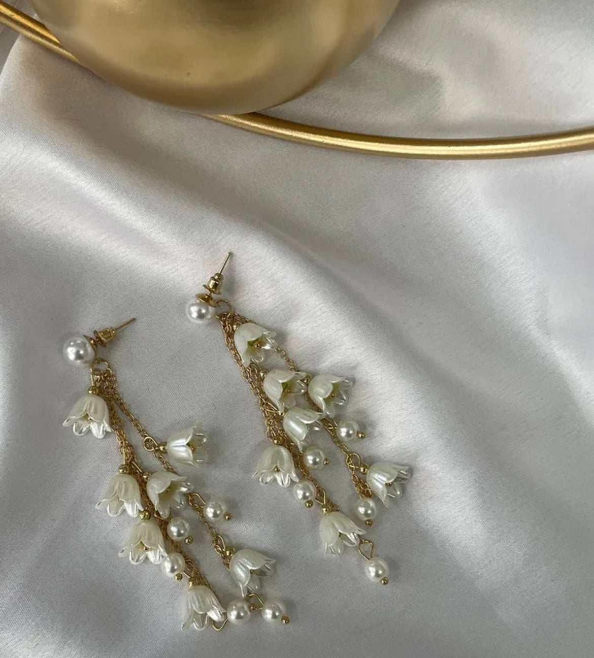 A romantic blend of dainty florals and luminous pearls. Each earring features cascading gold-toned chains adorned with handcrafted flower charms and glistening pearl drops that sway gracefully with every movement. Their soft, feminine allure makes them perfect for garden parties, festive celebrations, or evenings when you want your style to bloom with grace.